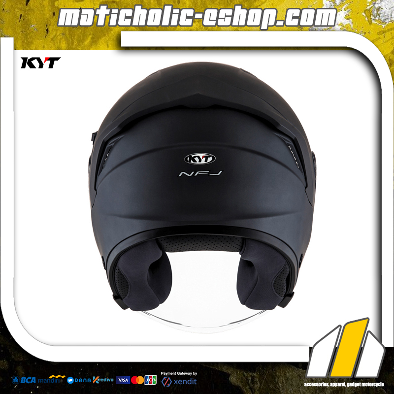 Helm KYT NF-J adalah helm tipe half face kategori “Street and Touring” generasi terbaru dari KYT yang sudah memenuhi standar Moto GP dengan design yang aerodinamis standar Moto GP. KYT NF-J menggabungkan teknologi aerodinamis ala motogp dengan fitur double visor dan kenyamanan yang handal untuk pengguna street dan touring yang profesional. Berbahan thermoplastic composite yang dirancang secara inovative dan Optic Class 1 Visor yang membuat pandangan pengendara menjadi lebih luas sehingga sangat nyaman dipakai pada posisi mengendara jenis apapun. Rachet Carbonized Look teknologi Quick release visor sehingga visor dapat dipasang dan dilepas tanpa menggunakan alat apapun. Juga terdapat visor lock system, dan memiliki sistem ventilasi yang bisa mengalirkan udara masuk ke dalam sehingga pemakai merasa nyaman, serta bagian dalam helm yang mudah dilepas & dicuci. Dilengkapi dengan Micrometric retention SystemDOT dan SNI 1811-2007, ECE 2205.