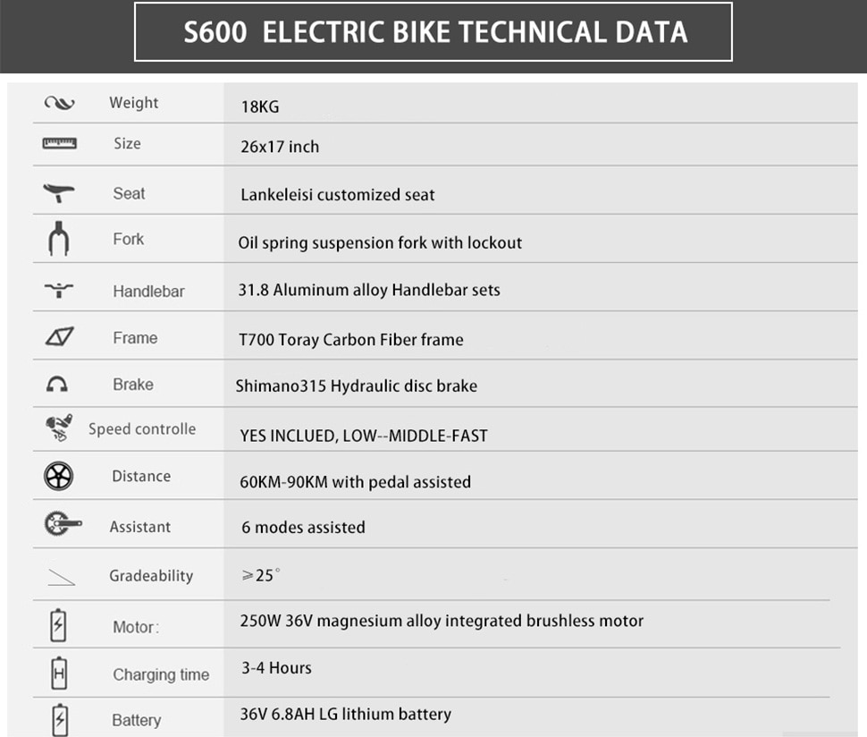 | Others | Motor: 250W Magnesium Alloy Integrated Brusless Motor Speed: 20-30 KM/H (Throttle Model) Fit for 160-180cm rider Load capacity: 150kg Distance: 60-90km with Pedal Assisted Assistant: 6 Modes Assisted Brake: Shimano315 Hydraulic Disc Brake Gradeability: 35 Degree |