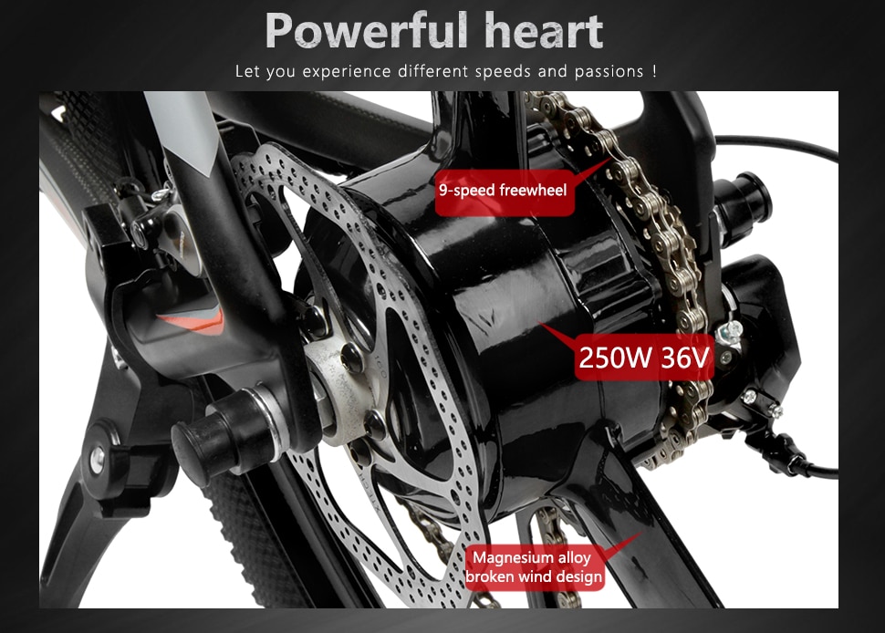 Powerful Heart Sepeda ini dibekali dengan 250w 36V motor serta 9 speed freewheel yang membuatnya mampu menembus kecepatan hingga 30km perjam dan menempuh hingga 90km.