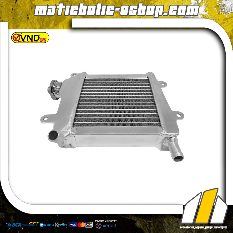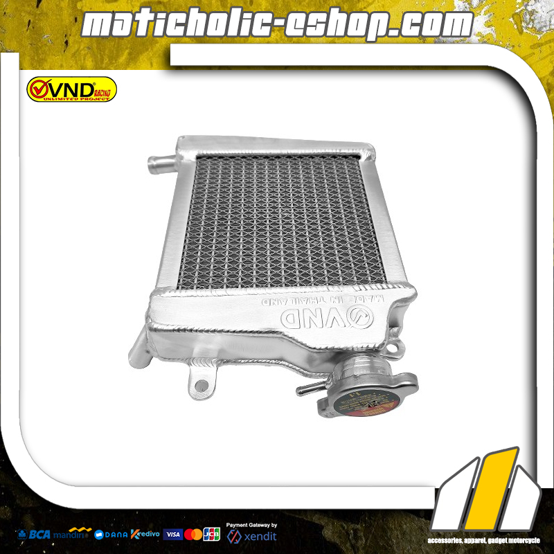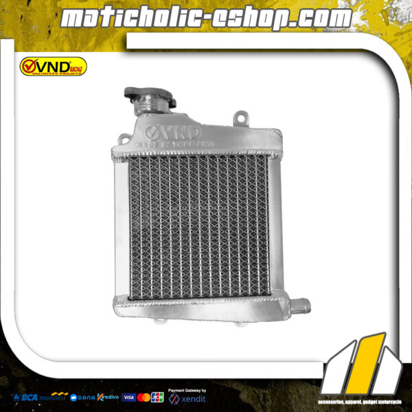 Radiator VND memiliki ukuran dan kapasitas jauh lebih besar dari bawaan pabrik sehingga lebih efektif meredam panas mesin hingga suhu ideal. Terdapat jaring pelindung di bagian depan untuk melindungi kisi kisi radiator dari benturan kerikil dan batu. Produk dijamin berkualitas berbahan aluminium dapat digunakan untuk kebutuhan harian, touring hingga balap