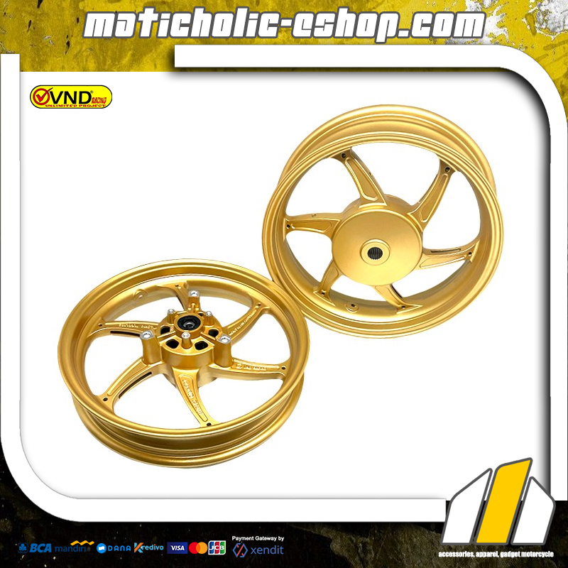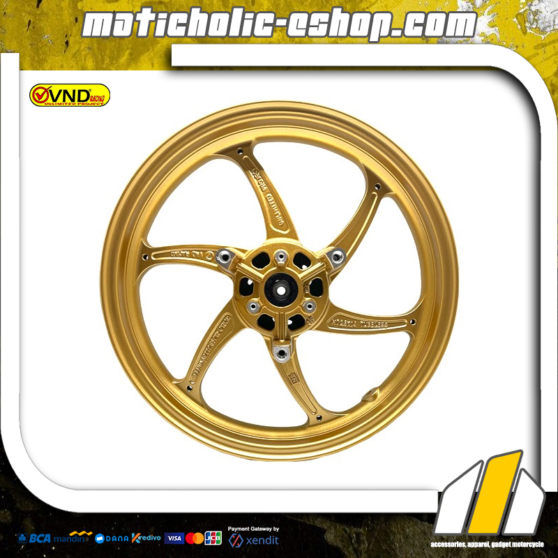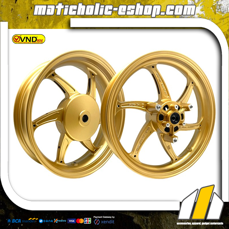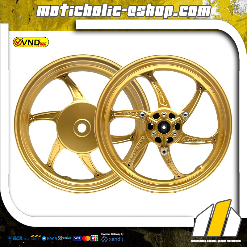 Velg VND model Six Star kami persembahkan bagi Anda pecinta velg palang enam miring. Desain menarik nan elegan dan bobot lebih ringan dengan berat velg depan 3,10 kg & belakang 3,80 kg total 6,90 kg dan ukuran velg depan 250×14 & belakang 350×14